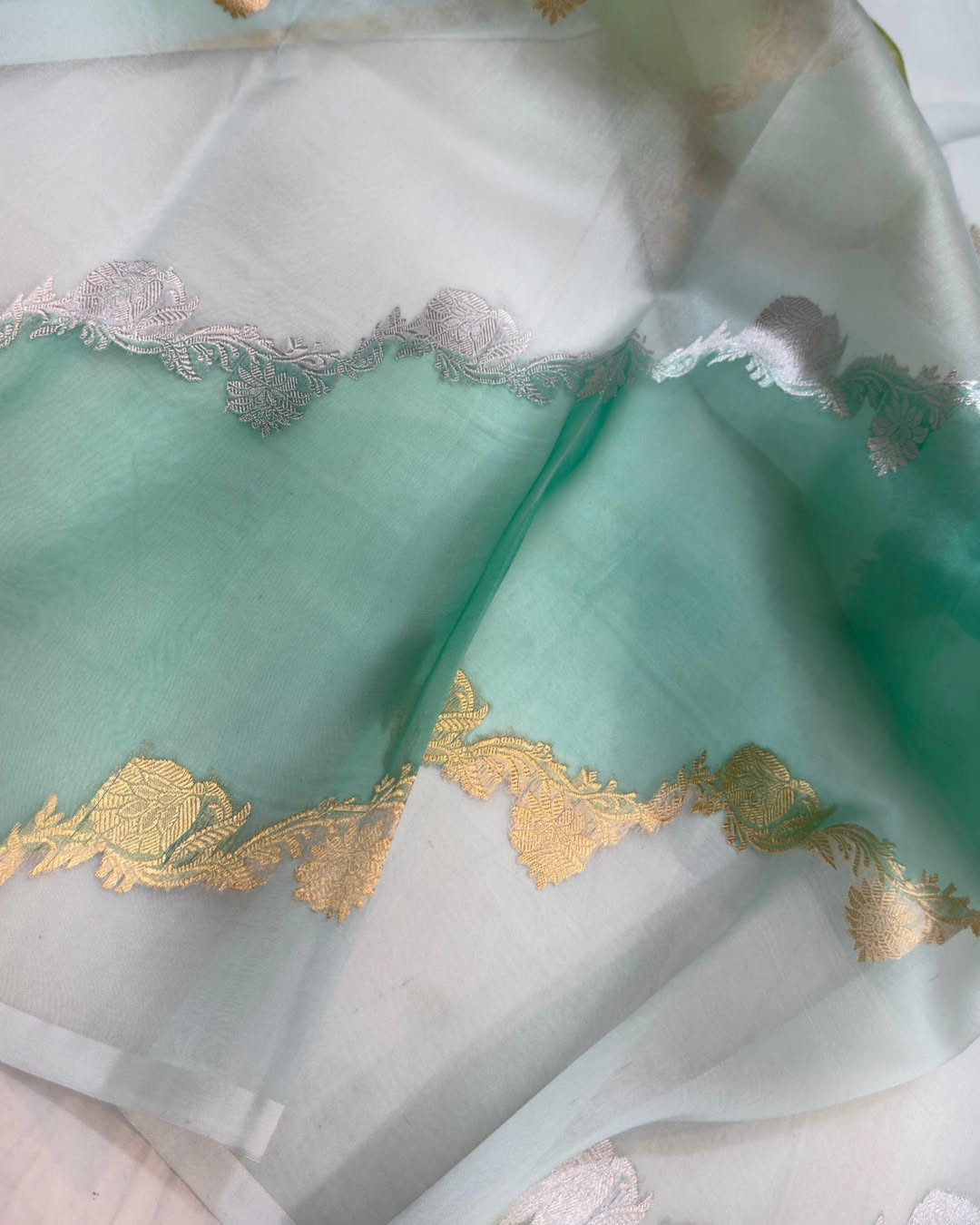 Sea Green Banarasi Handloom Kora Organza Silk Meenakari Saree