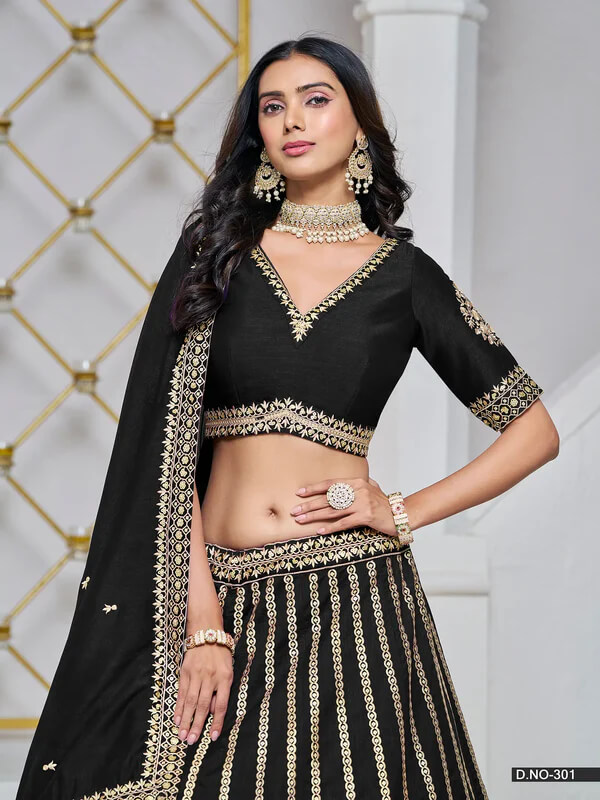 black art silk lehenga, designer black lehenga choli, embroidered black lehenga, party wear silk lehenga, wedding black lehenga, festive thread & sequins lehenga, luxury black lehenga choli