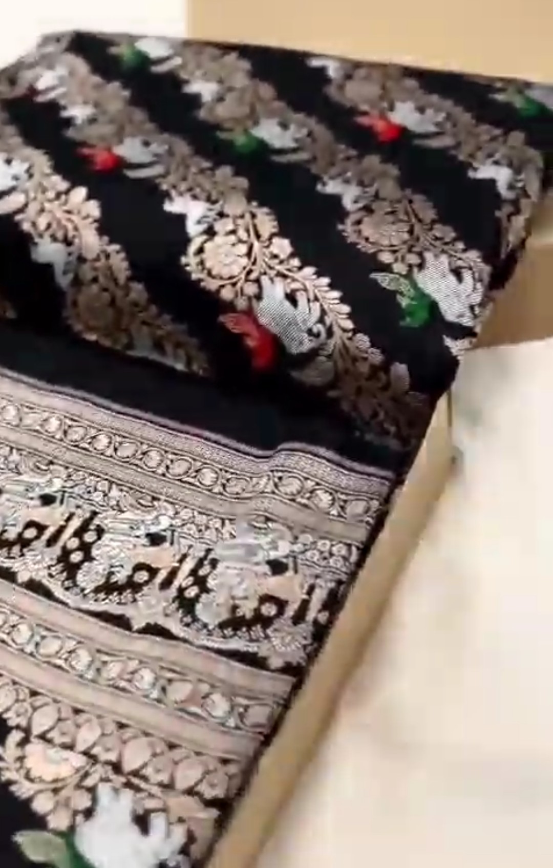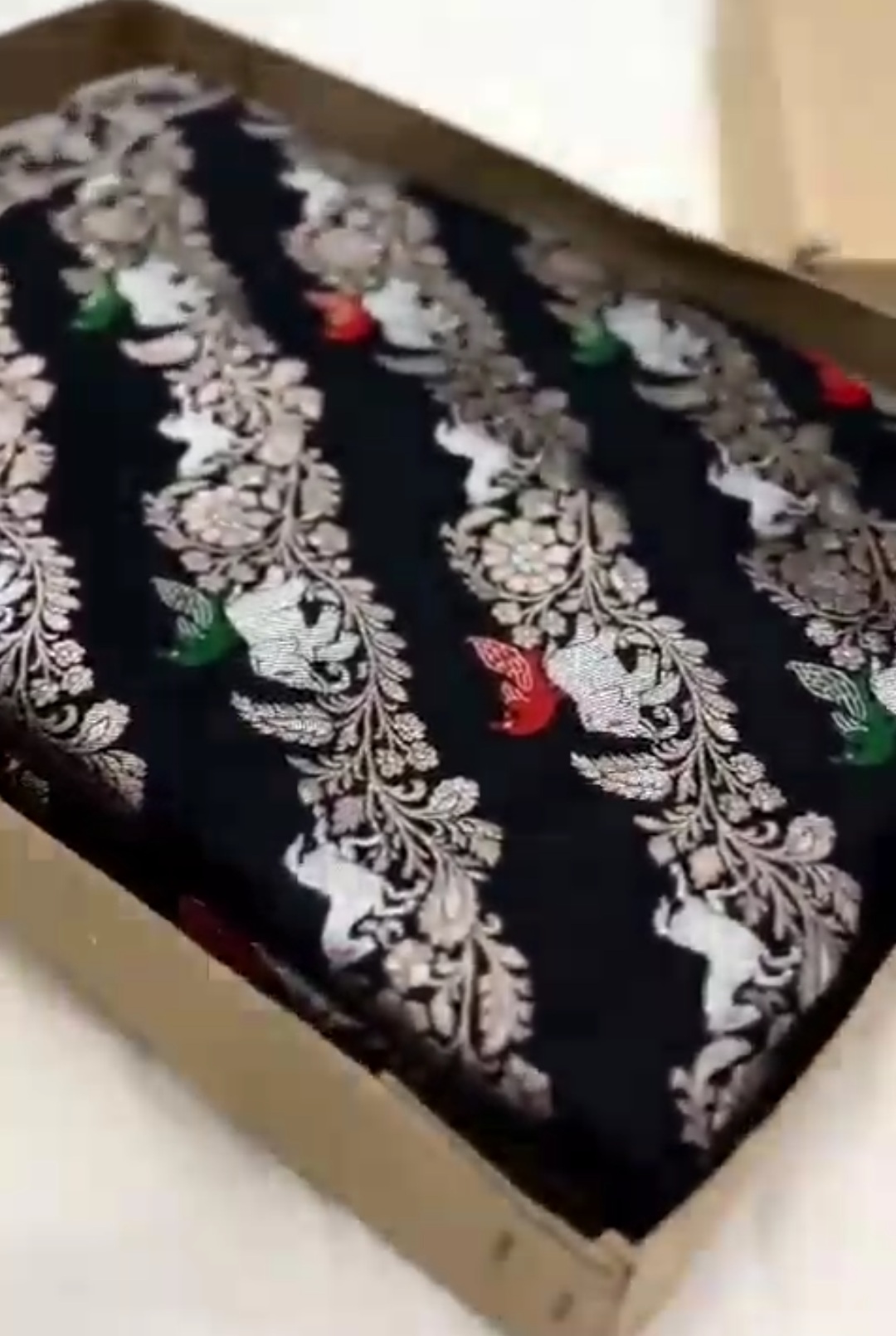 Black Banarasi Handloom Katan Silk Shikargah Meenakari Saree