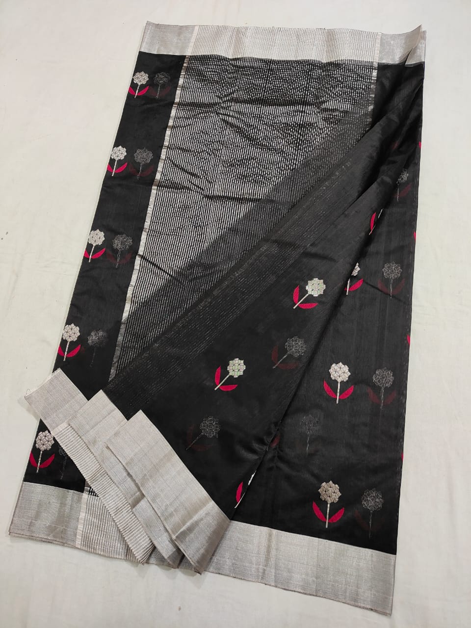 Black Chanderi Handloom Pattu Silk Handwork Saree