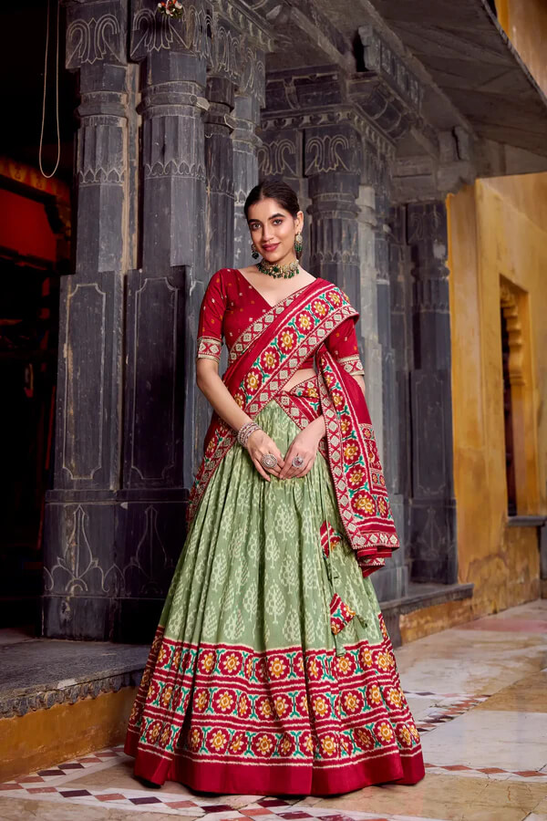 Grace your festive look with this sea green and red Tussar silk lehenga featuring Ikkat print and a 3.5-meter flair. Paired with a matching blouse and dupatta, with embroidery lace—perfect for traditional charm.