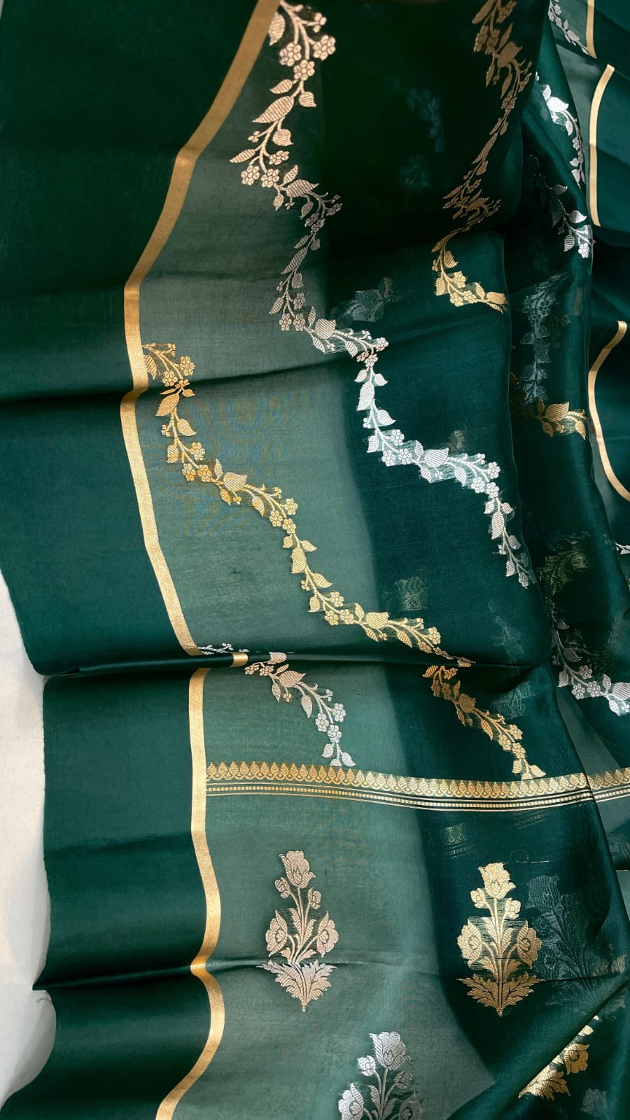 Dark Green Banarasi Handloom Kora Organza Silk Saree