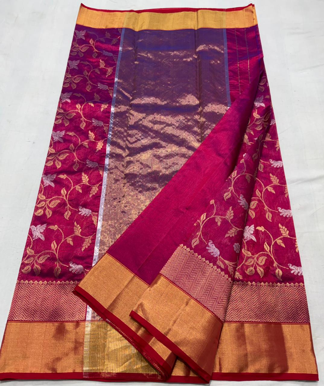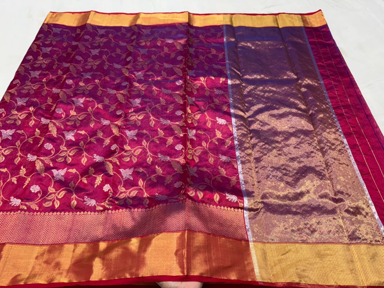Dark Pink Chanderi Handloom Pattu Silk Shikargah Handwork Saree