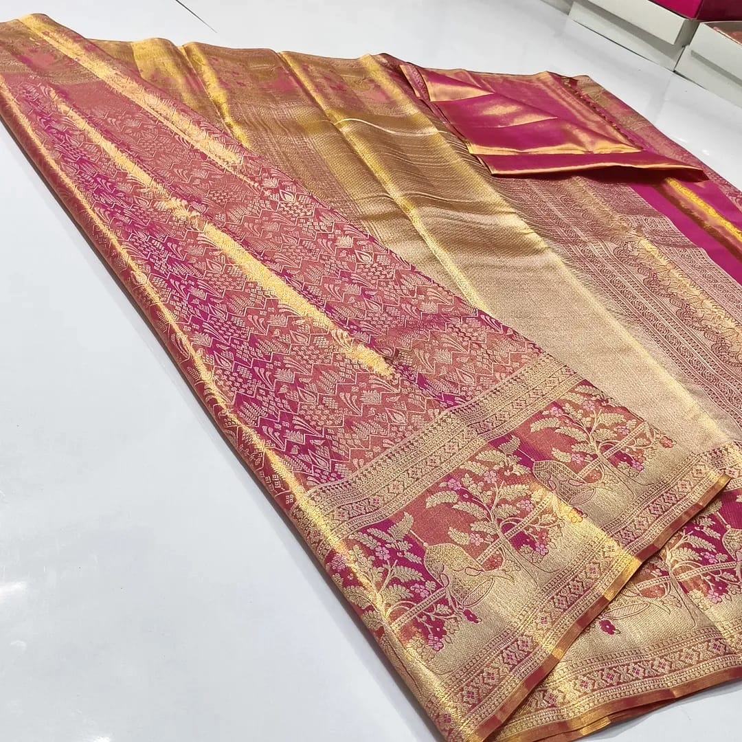 Dark Pink Kanchipuram Handloom Tissue Brocade Silk Saree
