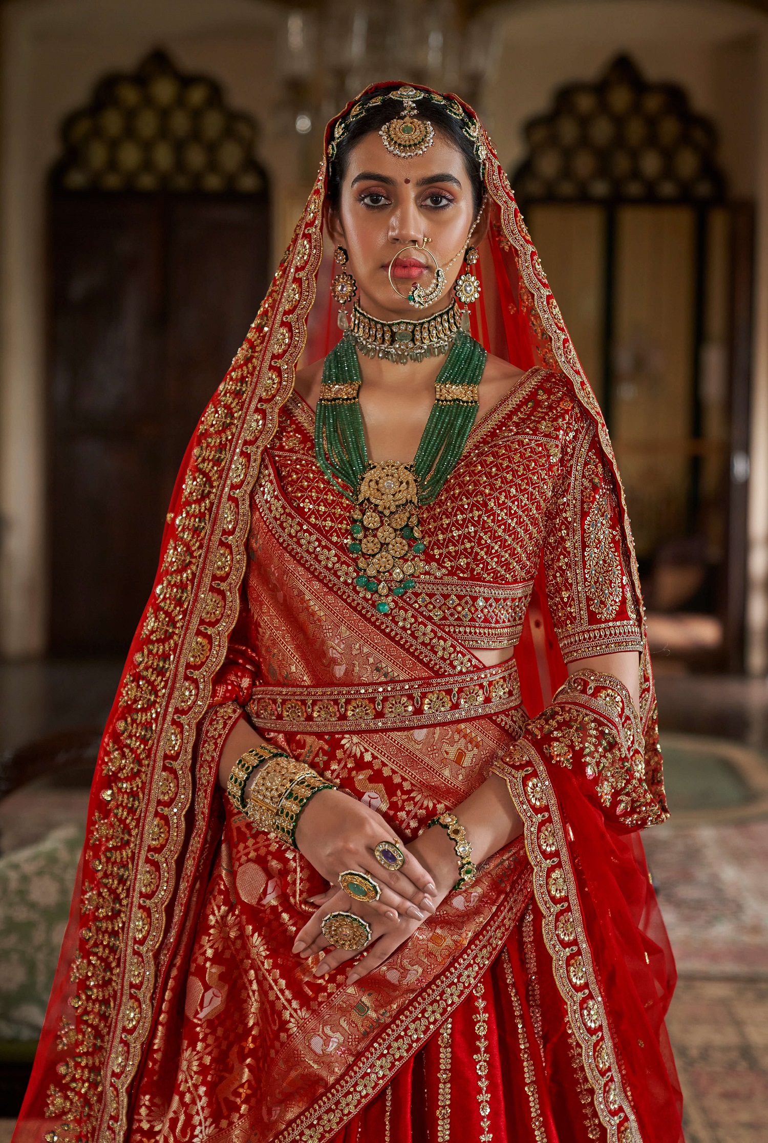 Designer Red Silk Bridal Lehenga with Heavy Embroidery & Sequins