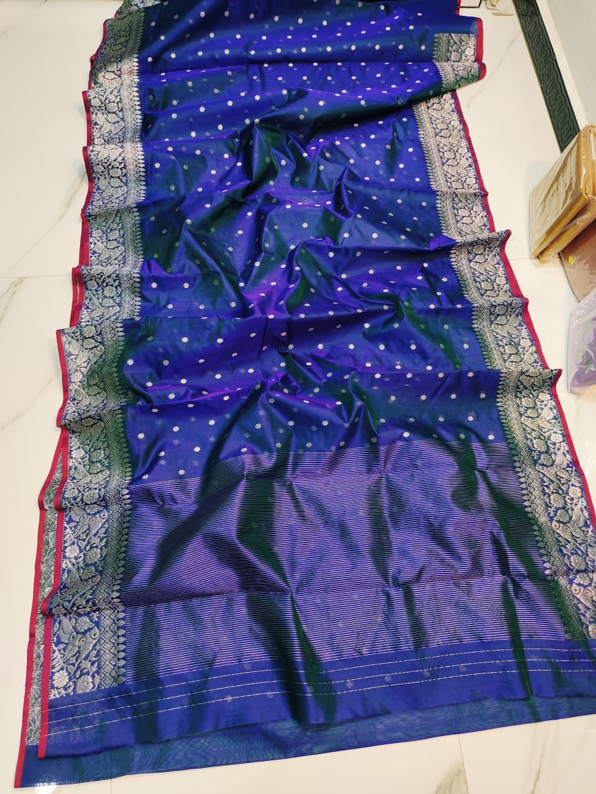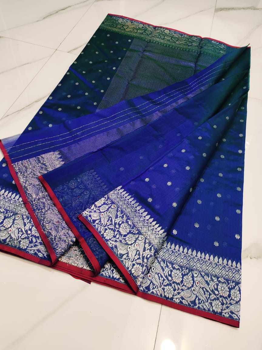 Dual Tone Blue Chanderi Handloom Pattu Silk Handwork Saree