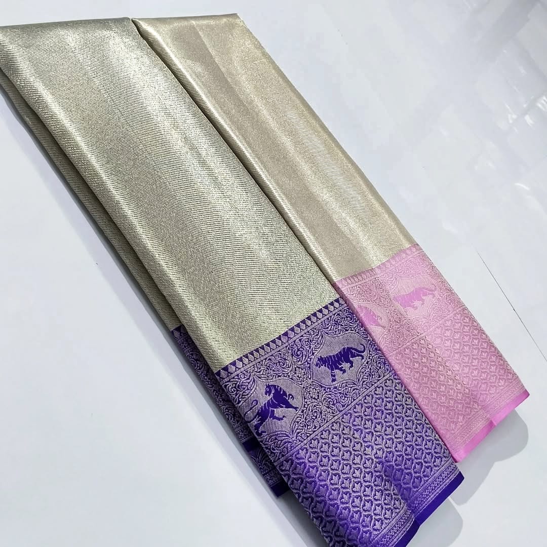Beige Kanchipuram Handloom Tissue Brocade Meenakari Silk Saree