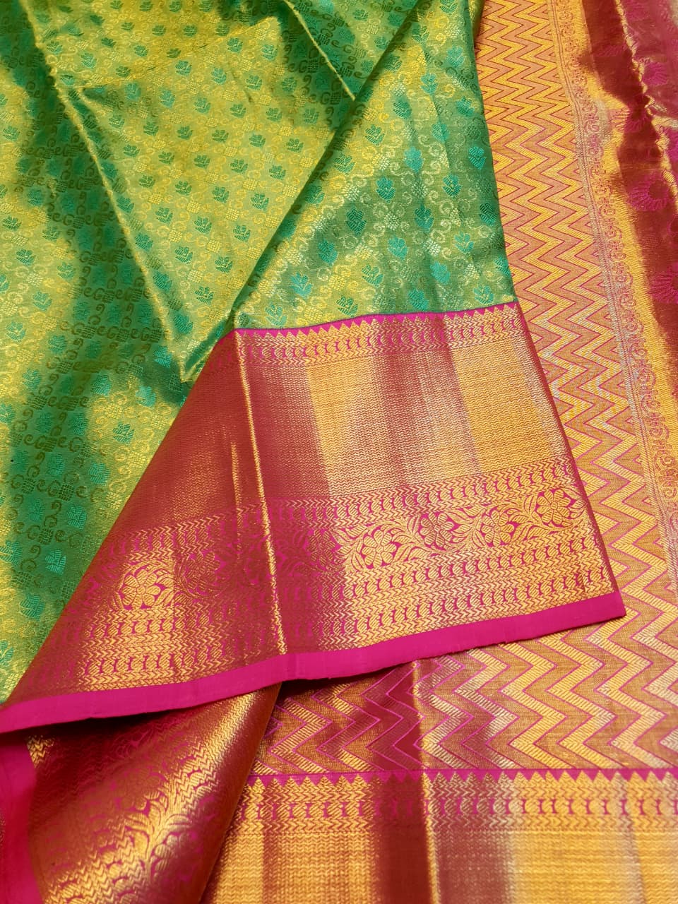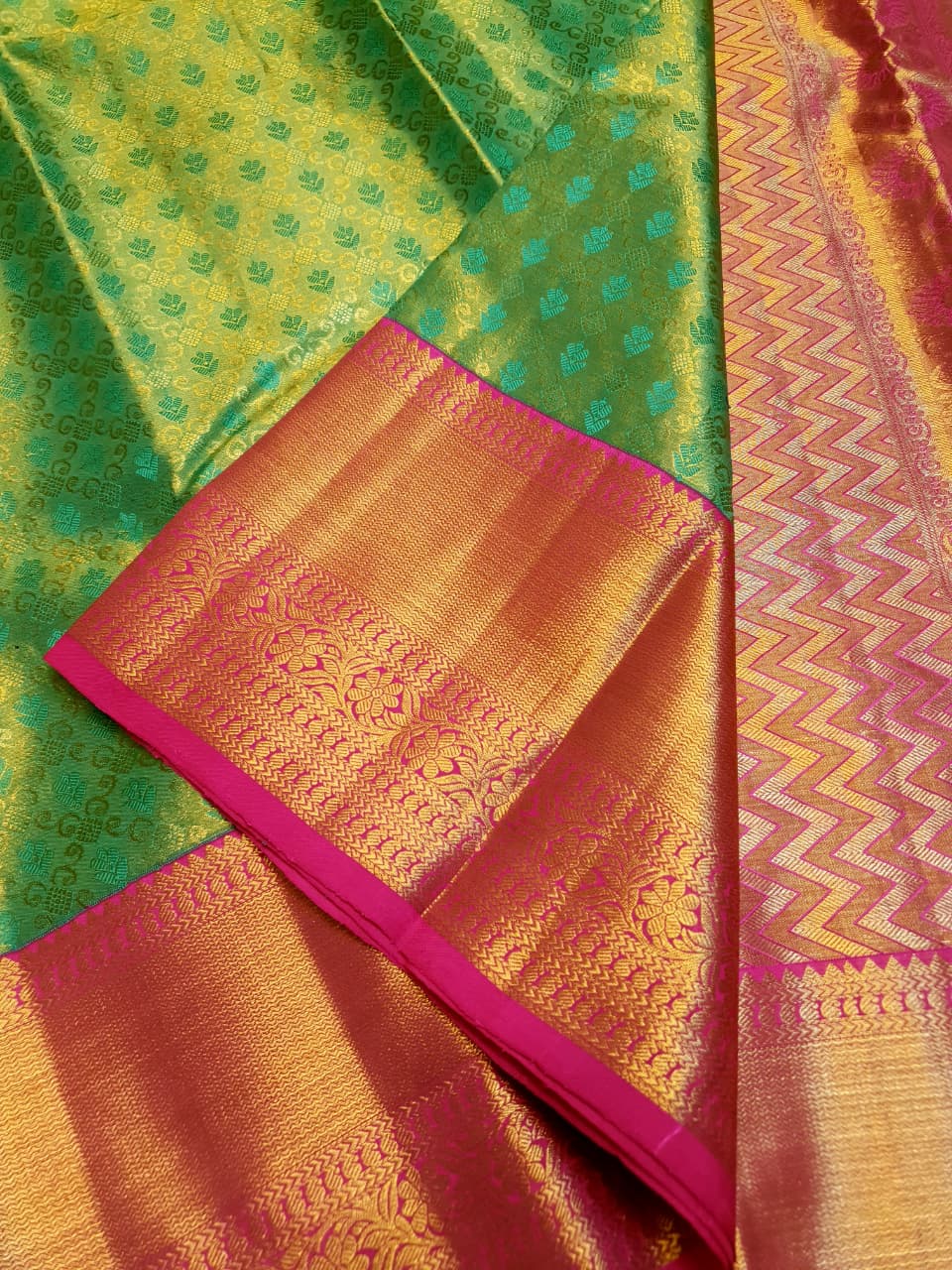 Lime Green Kanchipuram Handloom 2G Gold Korvai Silk Saree