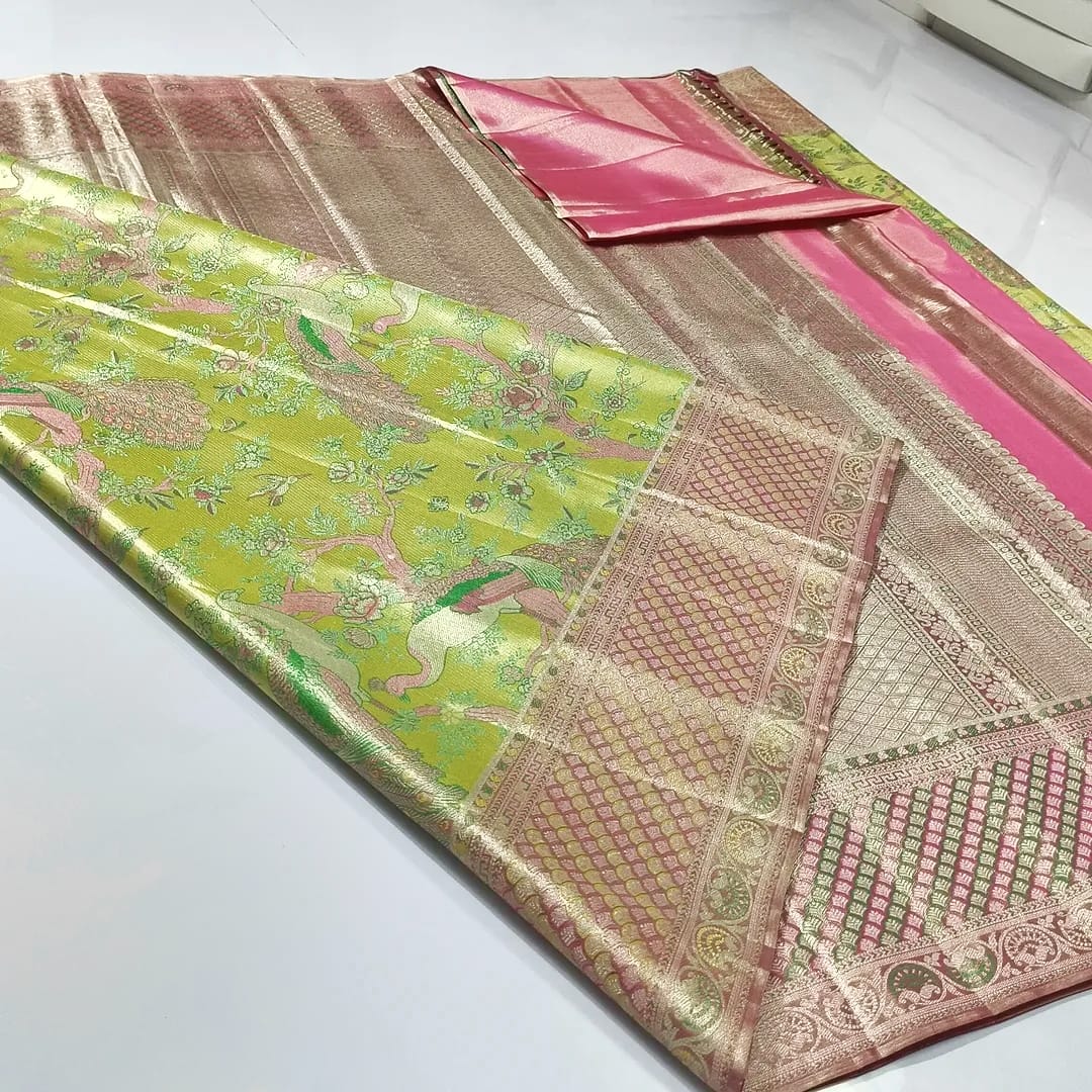 Lime Green Kanchipuram Handloom Tissue Brocade Meenakari Silk Saree