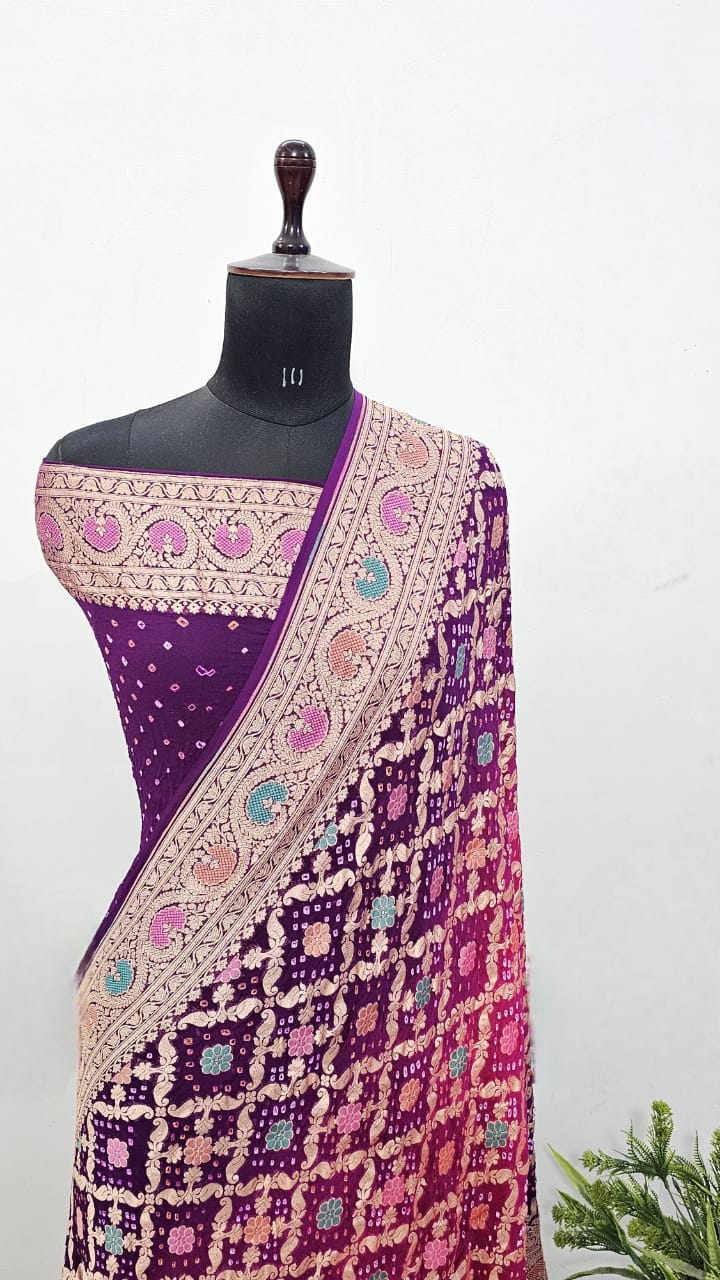 Purple Banarasi Handloom Gold Zari Bandhani Georgette Silk Saree