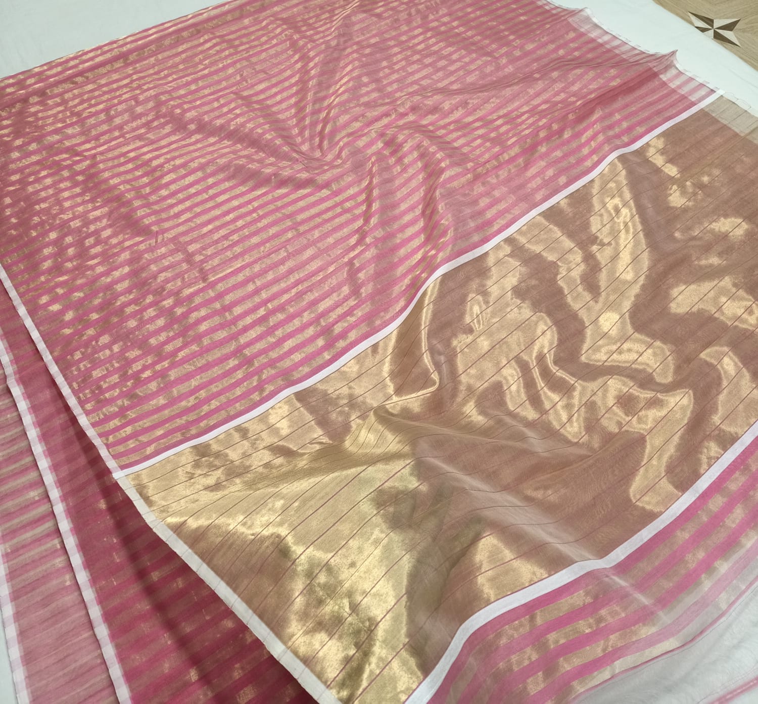 Pastel Pink Chanderi Handloom Cotton Silk Striped Saree