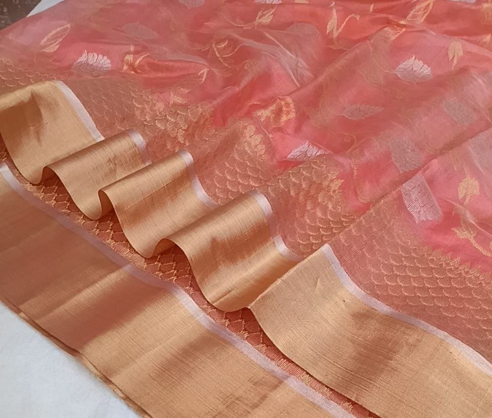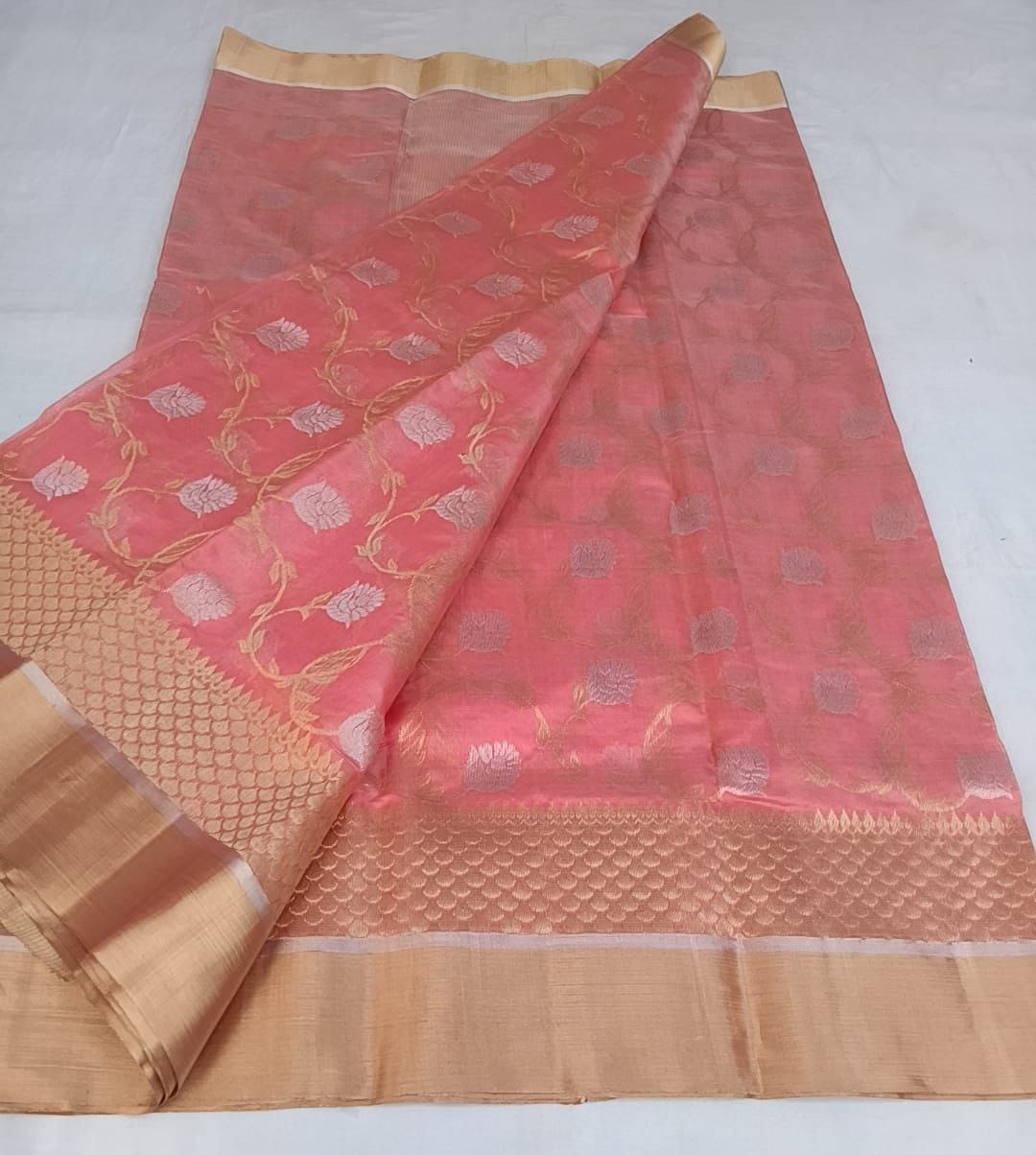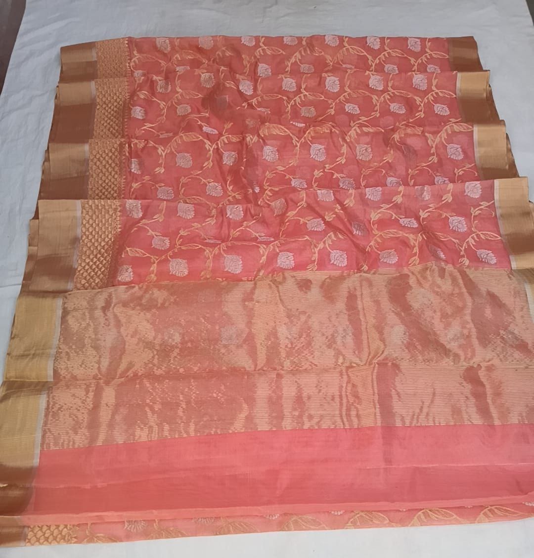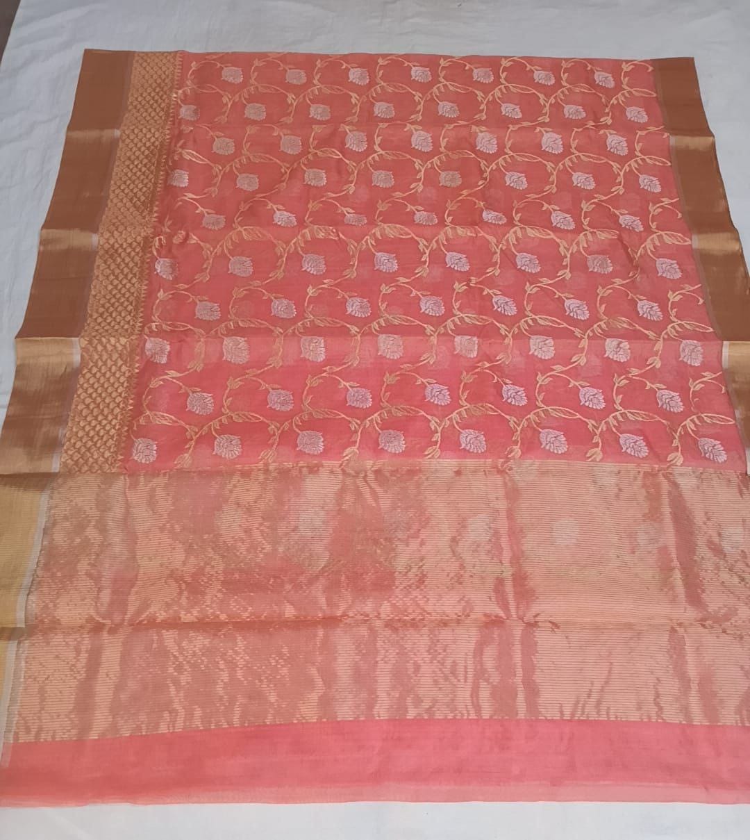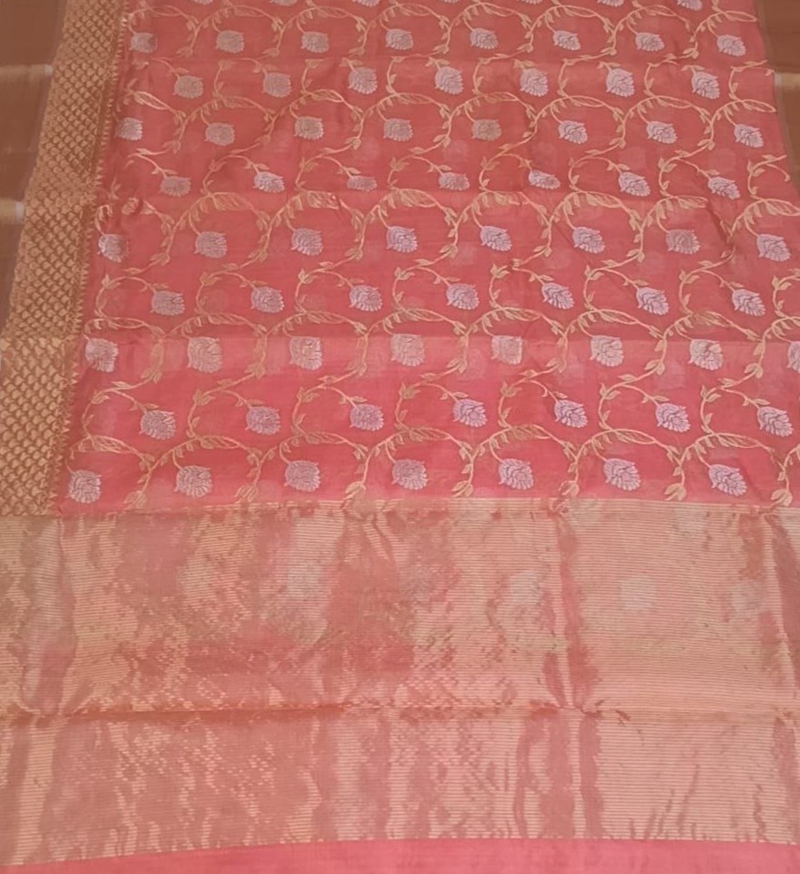 Peach Chanderi Handloom Pattu Silk Handwork Saree