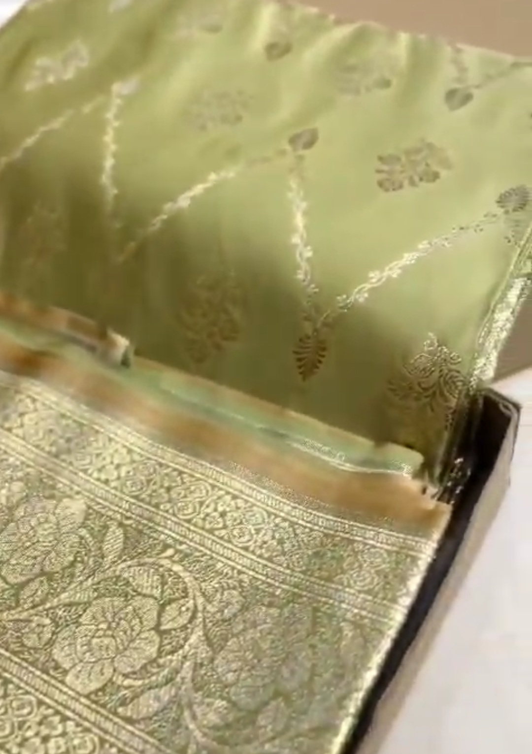 Pastel Lemon Green Banarasi Satin Katan Silk Saree