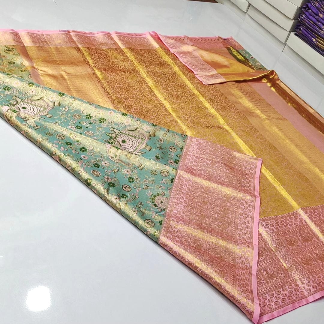 Pista Green Kanchipuram Handloom Tissue Brocade 4D Meenakari Silk Saree
