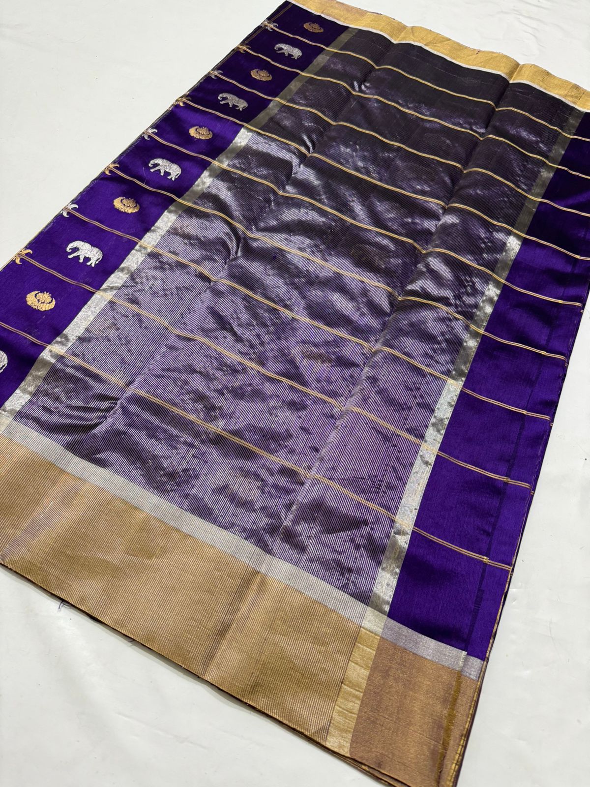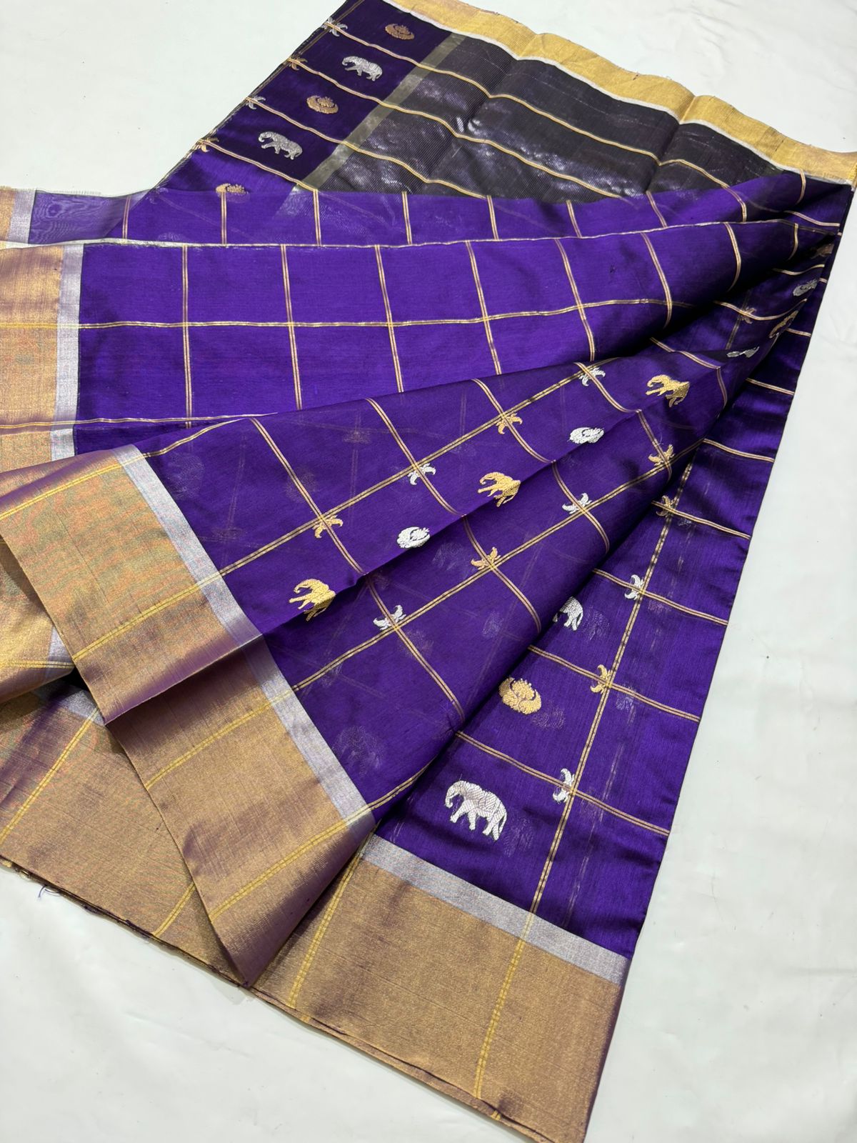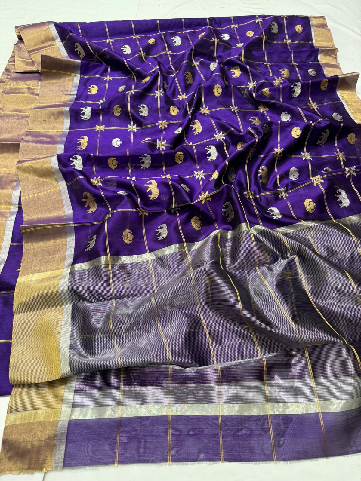 Chanderi Traditional Saree, Chanderi Handloom Pure Pattu SIlk Saree, Chanderi Handloom Gold and Silver Zari Checks Saree