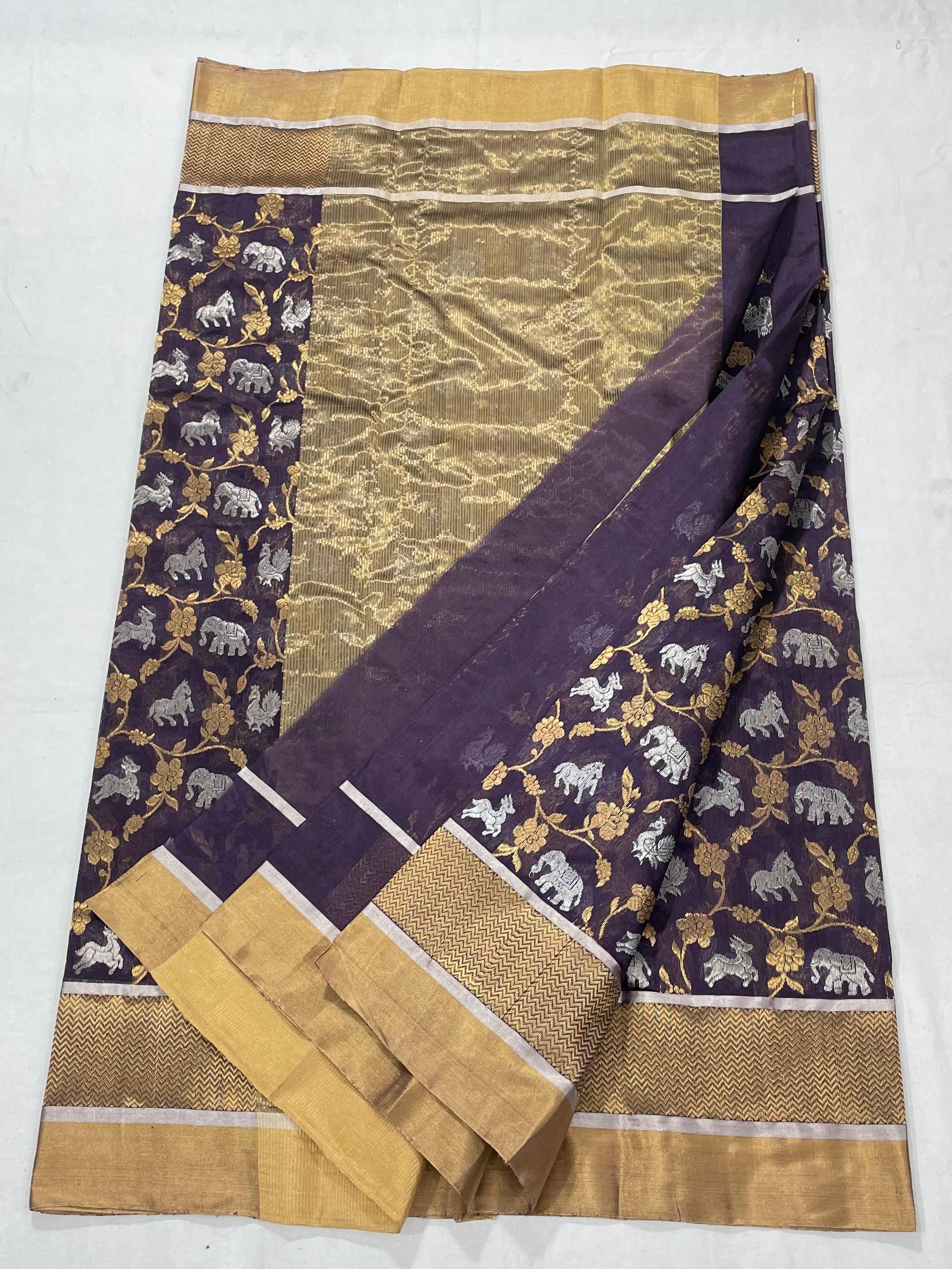 Purple Chanderi Handloom Pattu Silk Shikargah Handwork Saree