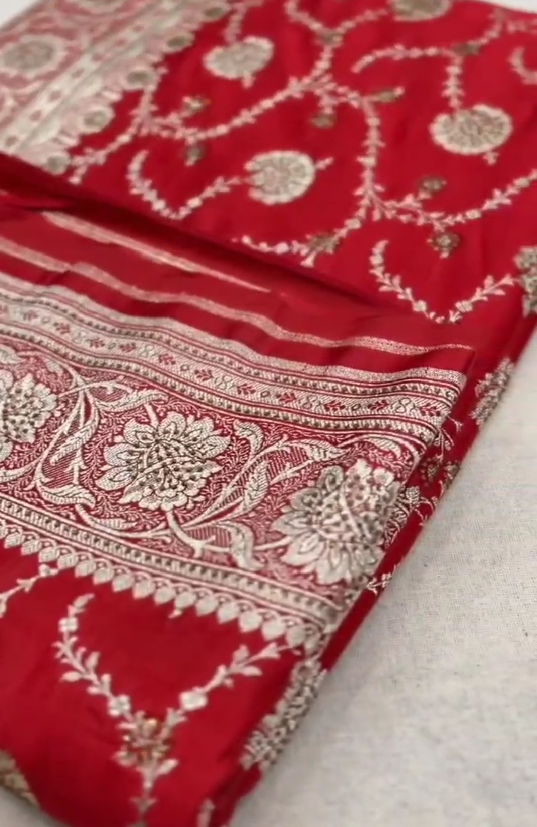 Red Banarasi Satin Katan Silk Swarovski Jangla Saree