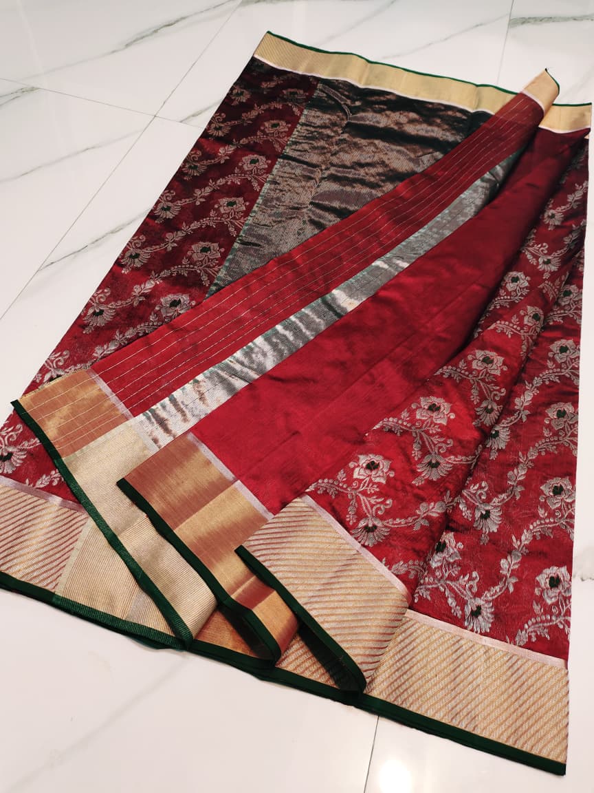 Red Chanderi Handloom Pattu Silk Meenakari Handwork Saree