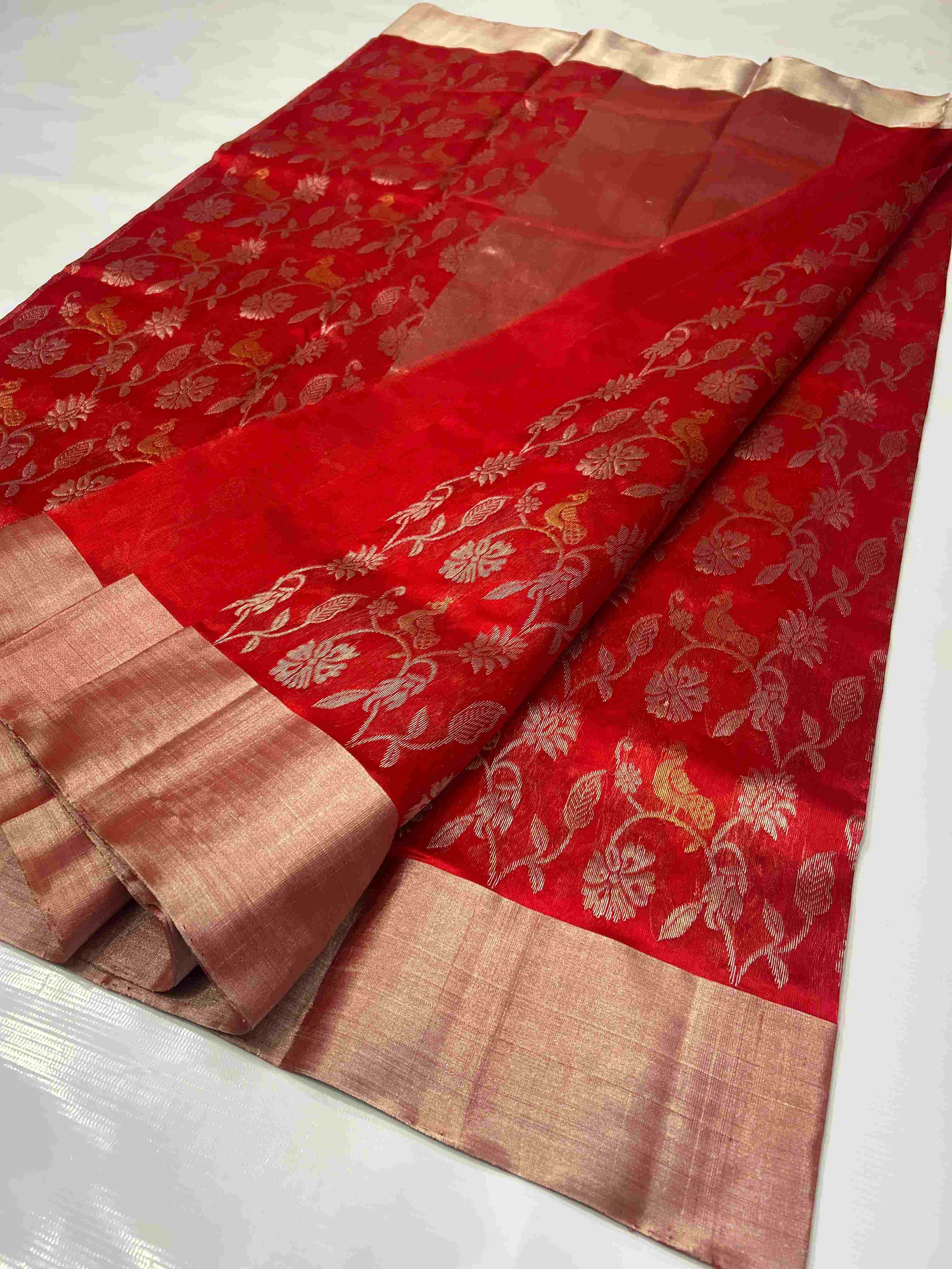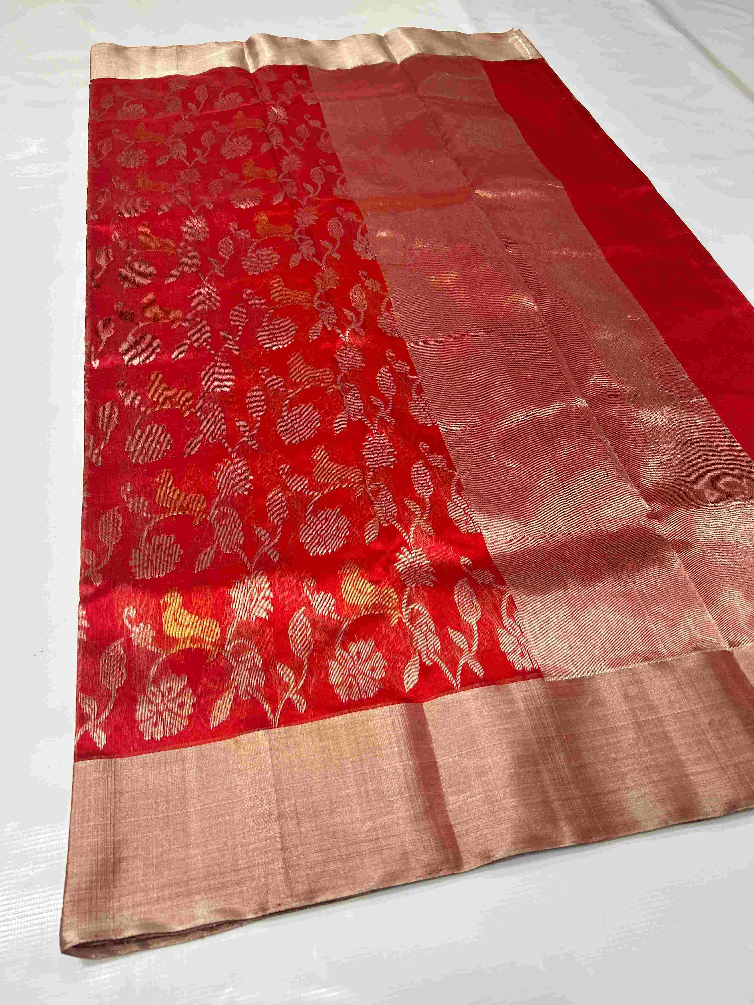 Red Chanderi Handloom Pattu Silk Meenakari Saree