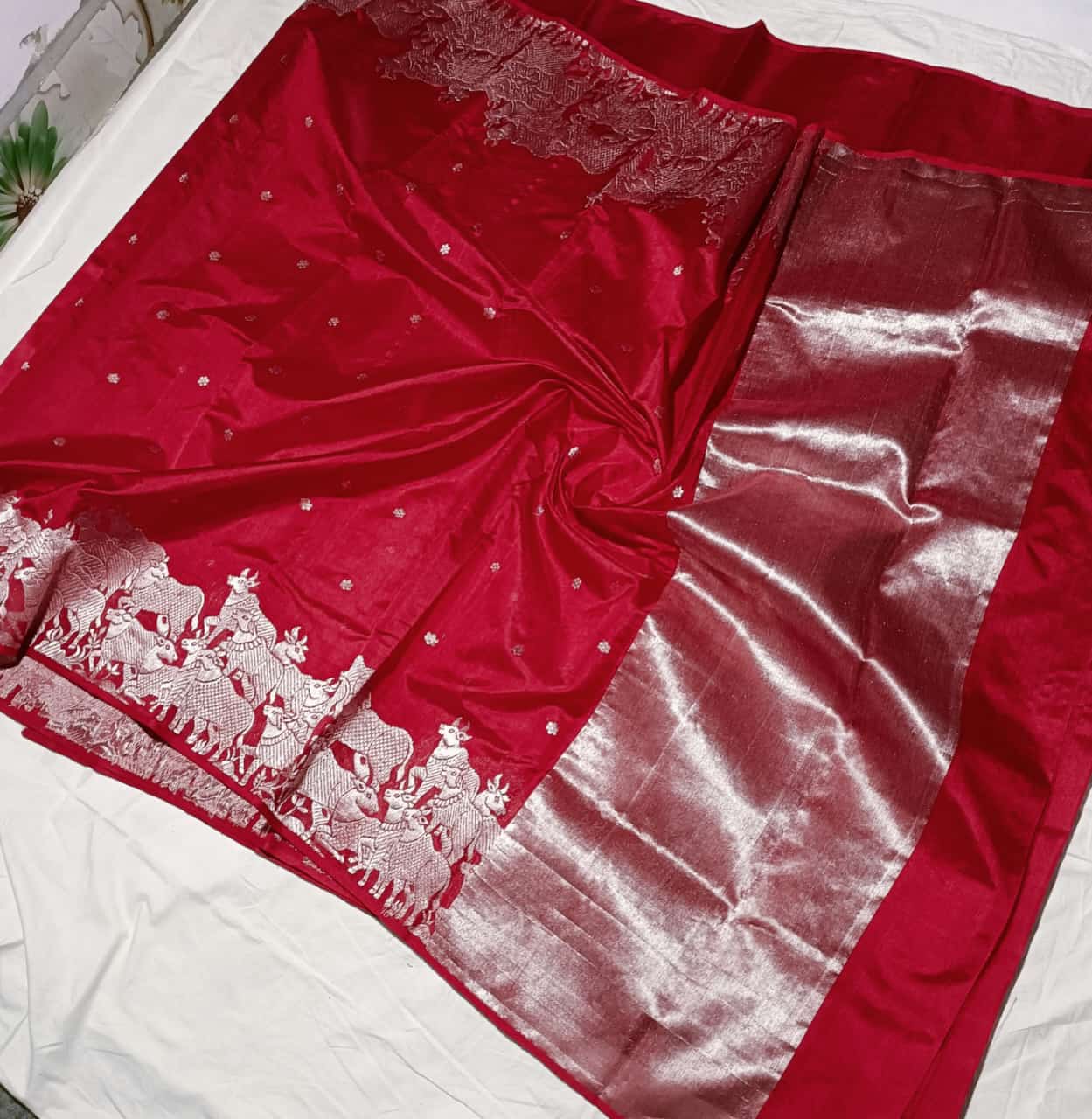 Red Chanderi Handloom Pattu Silk Meenakari Handwork Saree