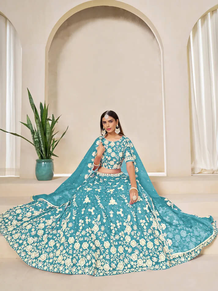 Ocean Blue Embroidered Net Lehenga Choli
