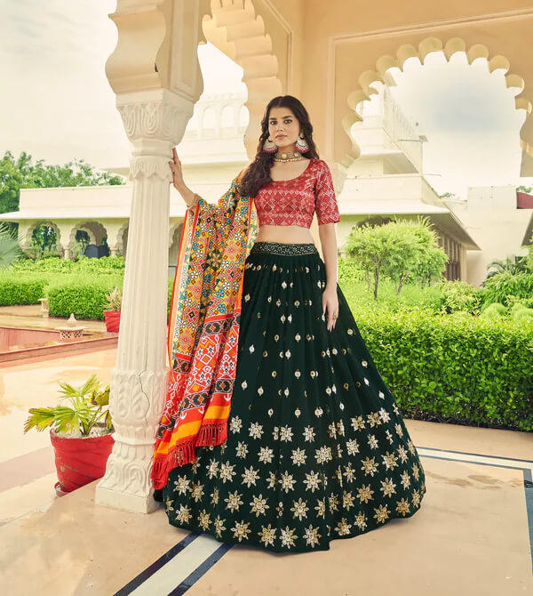green lehenga choli, georgette embroidered lehenga, thread sequins lehenga, wedding green lehenga, festive wear lehenga, designer georgette lehenga, party wear lehenga choli