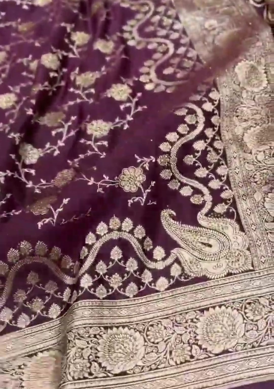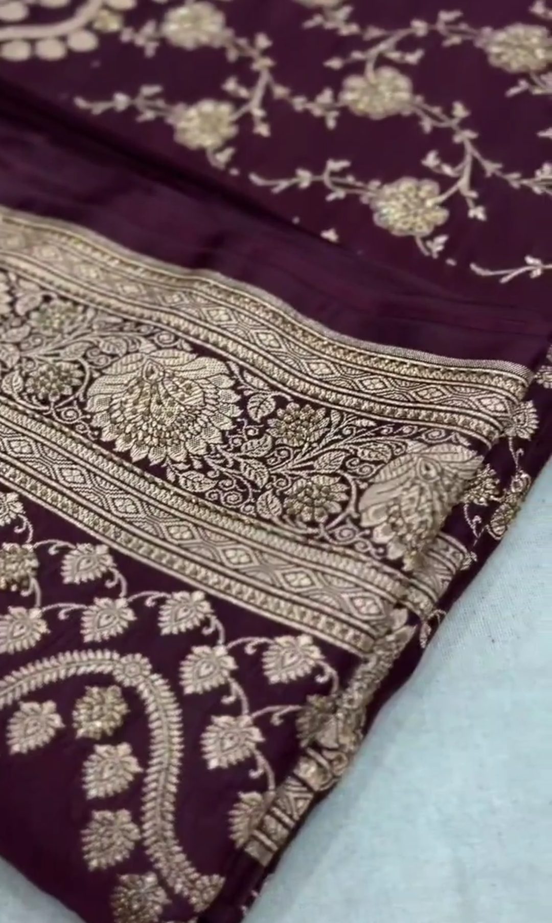 Wine Banarasi Satin Katan Silk Swarovski Jangla Saree