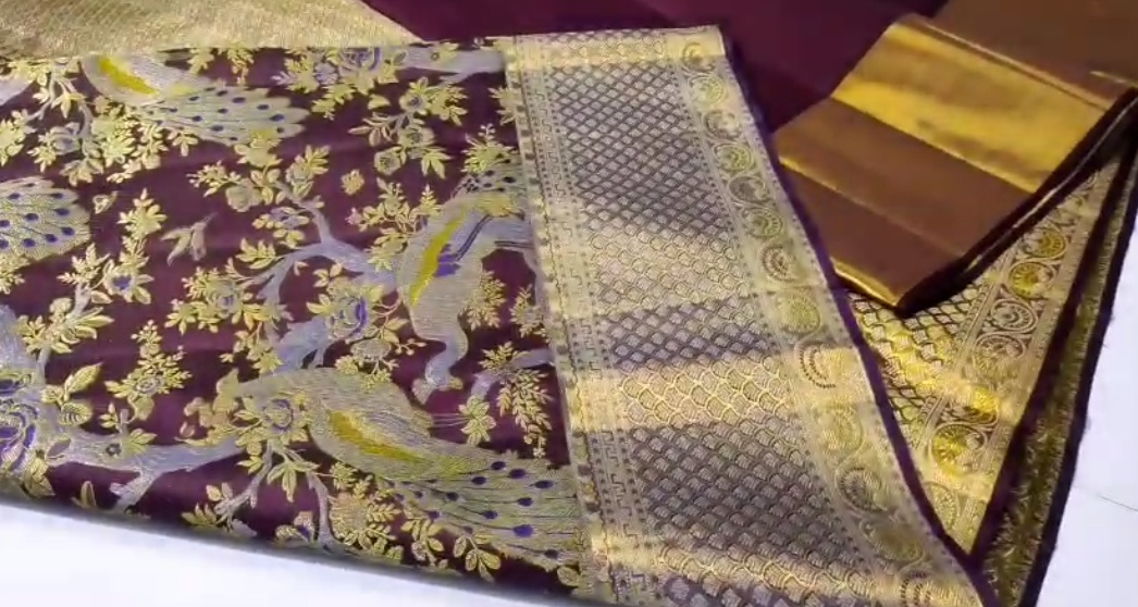 Wine Kanchipuram Handloom Tissue Brocade 1G Gold Bridal Saree